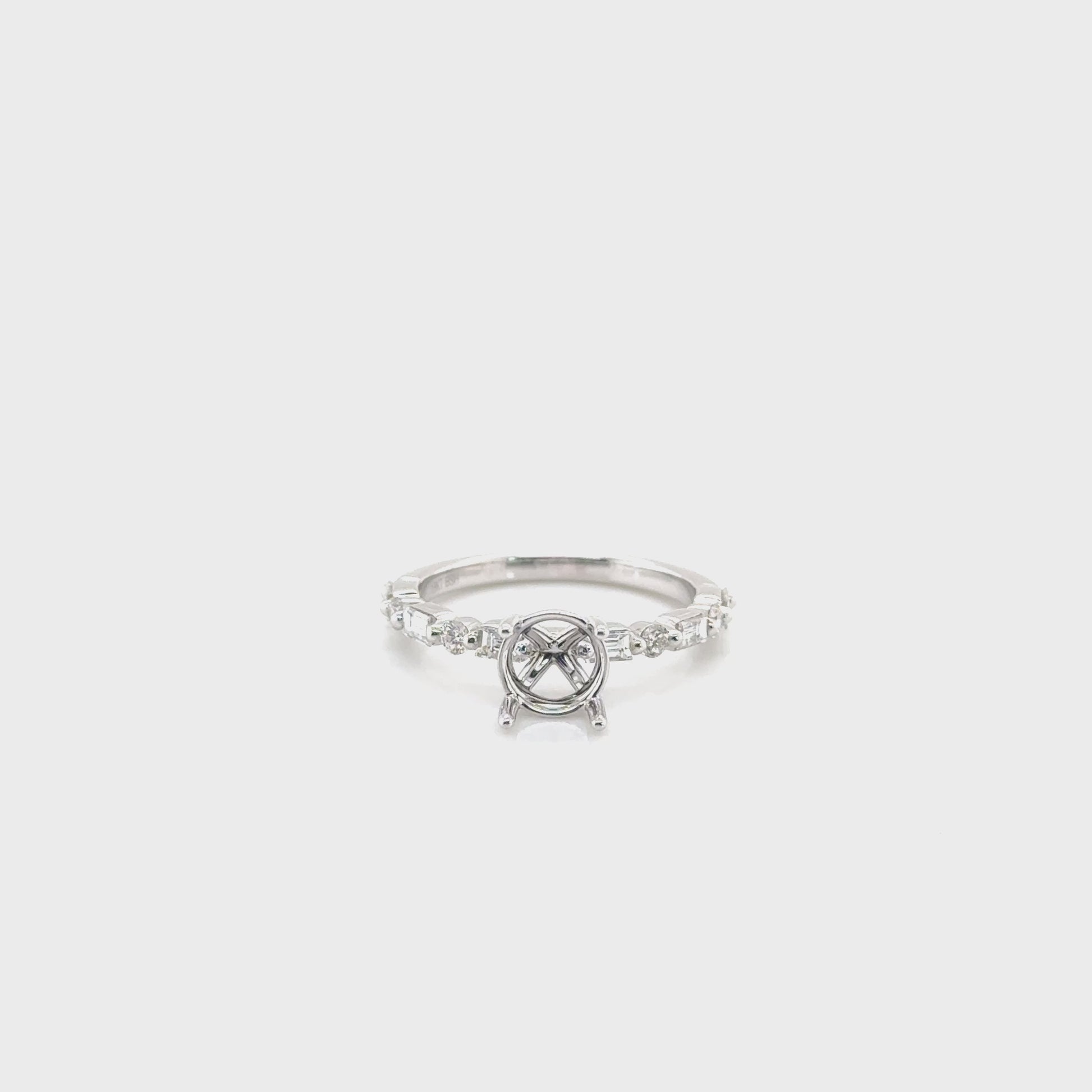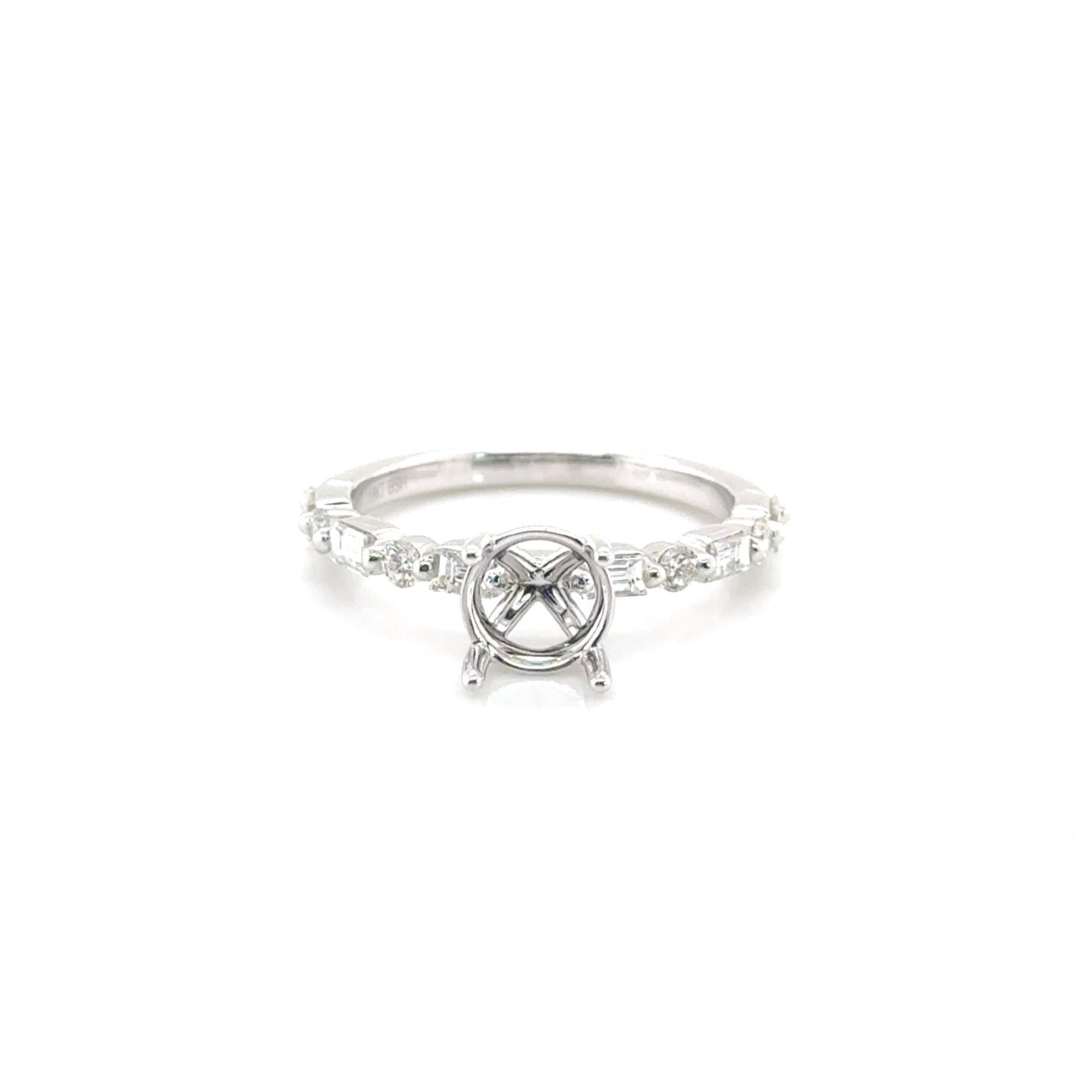 What truly sets this ring apart is its distinctive band. Adorned with a harmonious blend of round and baguette-cut diamonds, the band creates a captivating play of light and texture. Each stone is meticulously set to form a pattern that’s as unique as your love story. The Belle Engagement Ring is a modern masterpiece that embodies elegance and individuality.