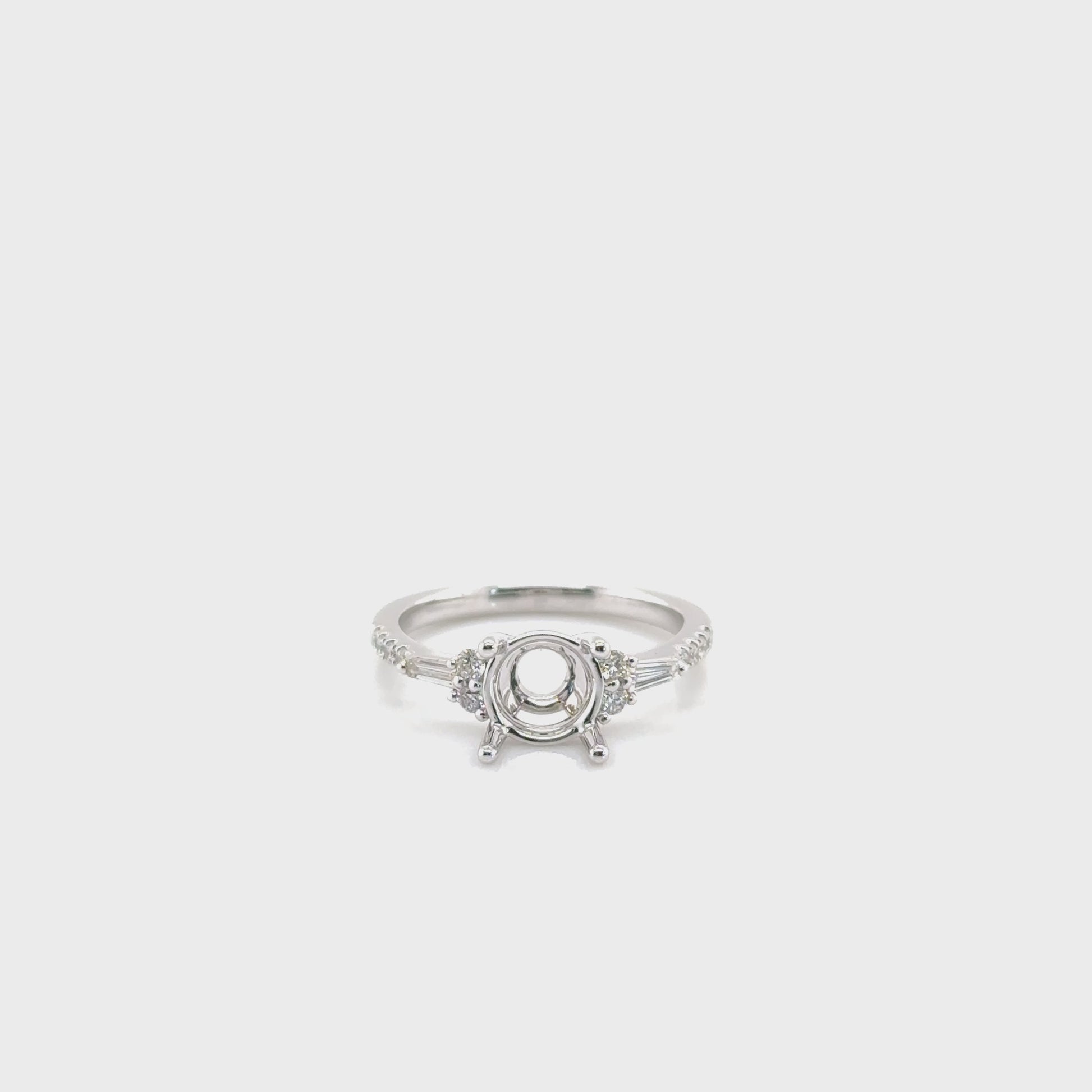 The band is adorned with sideways baguette diamonds and smaller round diamonds, uniquely set to catch light from every angle. Perfect for those who desire something truly one-of-a-kind, this ring is a statement of love and individuality. Celebrate your special bond with the Maelis Engagement Ring, a piece as extraordinary as your love story.