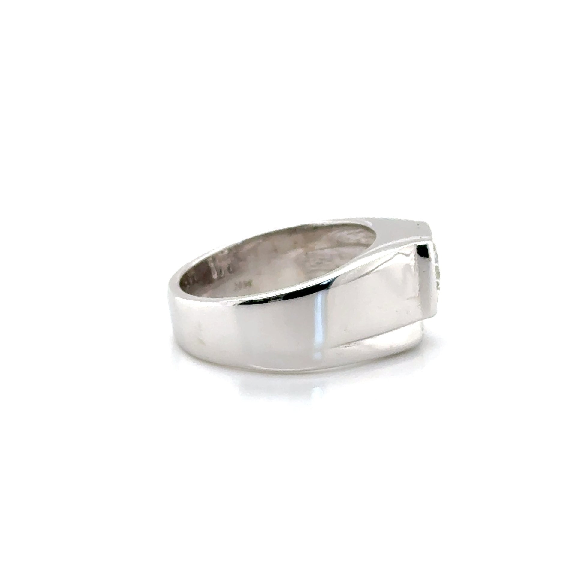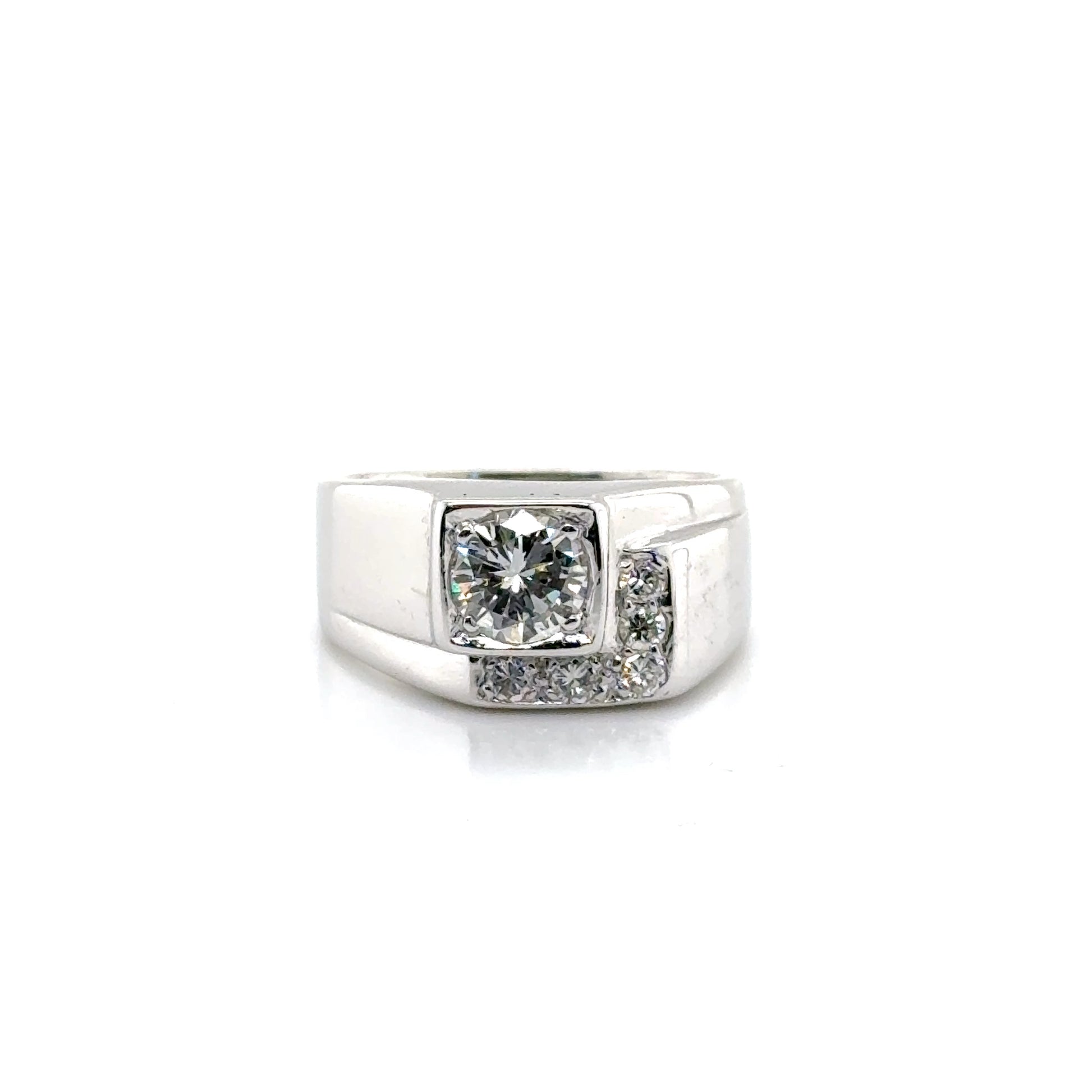 This bold men’s diamond ring combines modern design with timeless elegance. Featuring a brilliant round-cut center diamond, accented by smaller shimmering stones, this ring is crafted from sleek white gold for a polished and refined look. The unique, asymmetric setting creates a distinct and sophisticated silhouette, perfect for the modern man who wants to stand out.