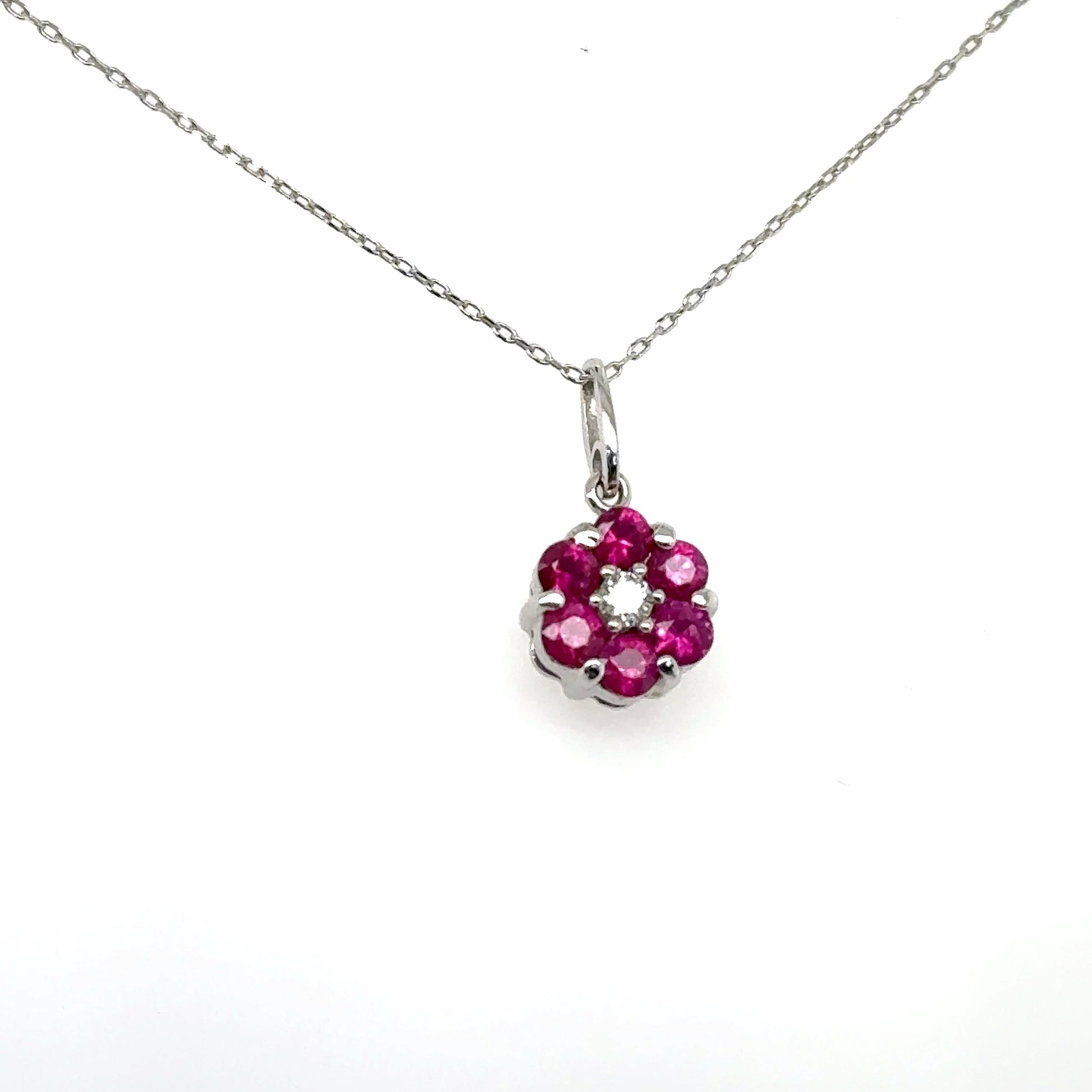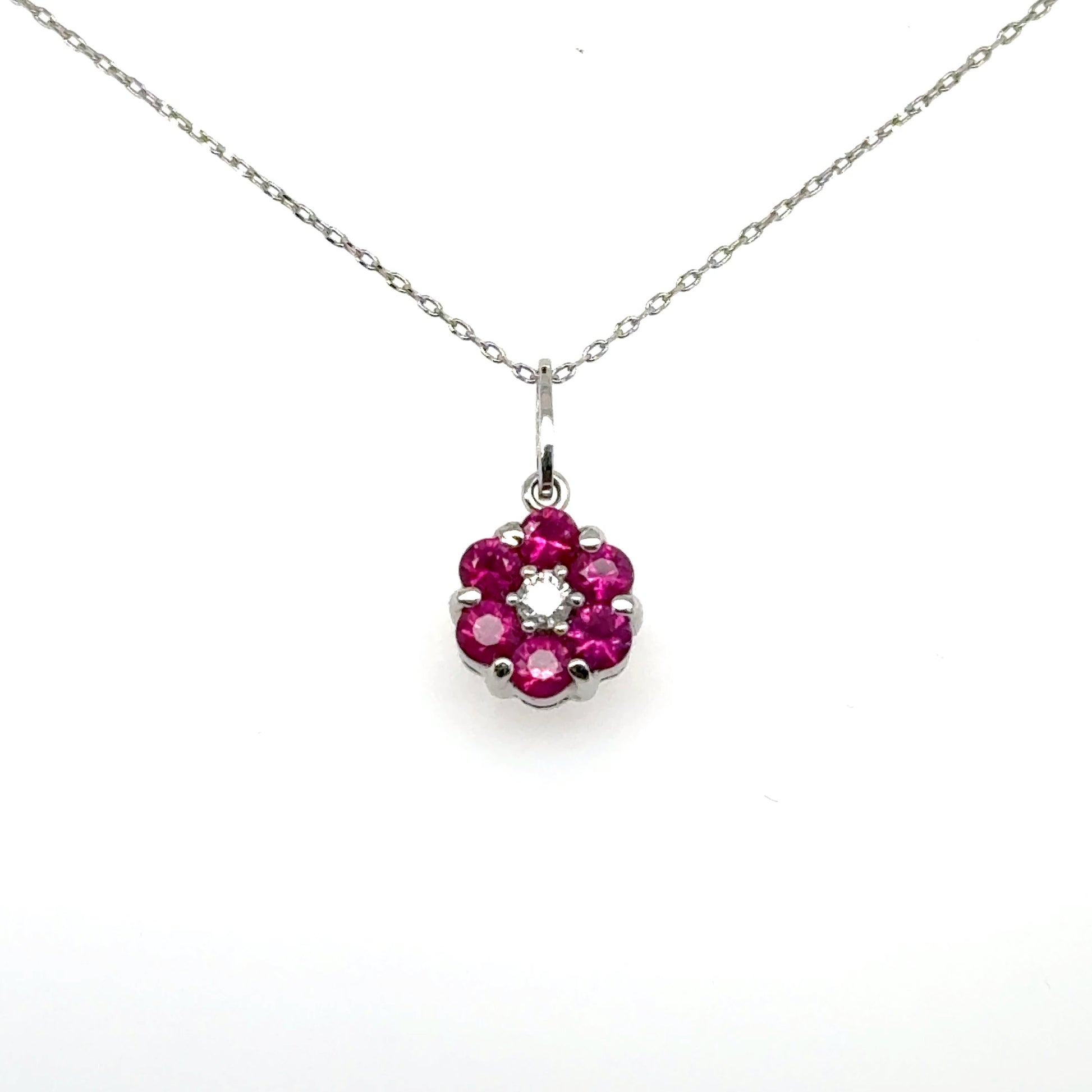 This pendant brings a touch of floral charm to your style with a playful pop of color. Featuring vibrant rubies arranged in a delicate flower shape, with a sparkling diamond at the center, it’s both elegant and fun.